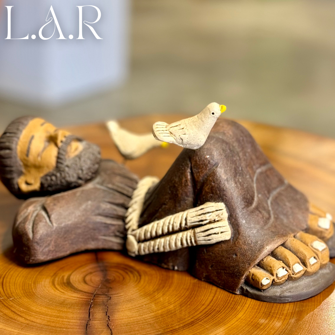 Essa escultura de barro pintada a mão, representa o São Francisco deitado, descansando com pombinhas repousando sobre si. Ela foi produzida por artesãos do estado do Piauí e, é perfeita para presentear devotos de São Francisco, veterinários e amantes dos animais e da natureza.