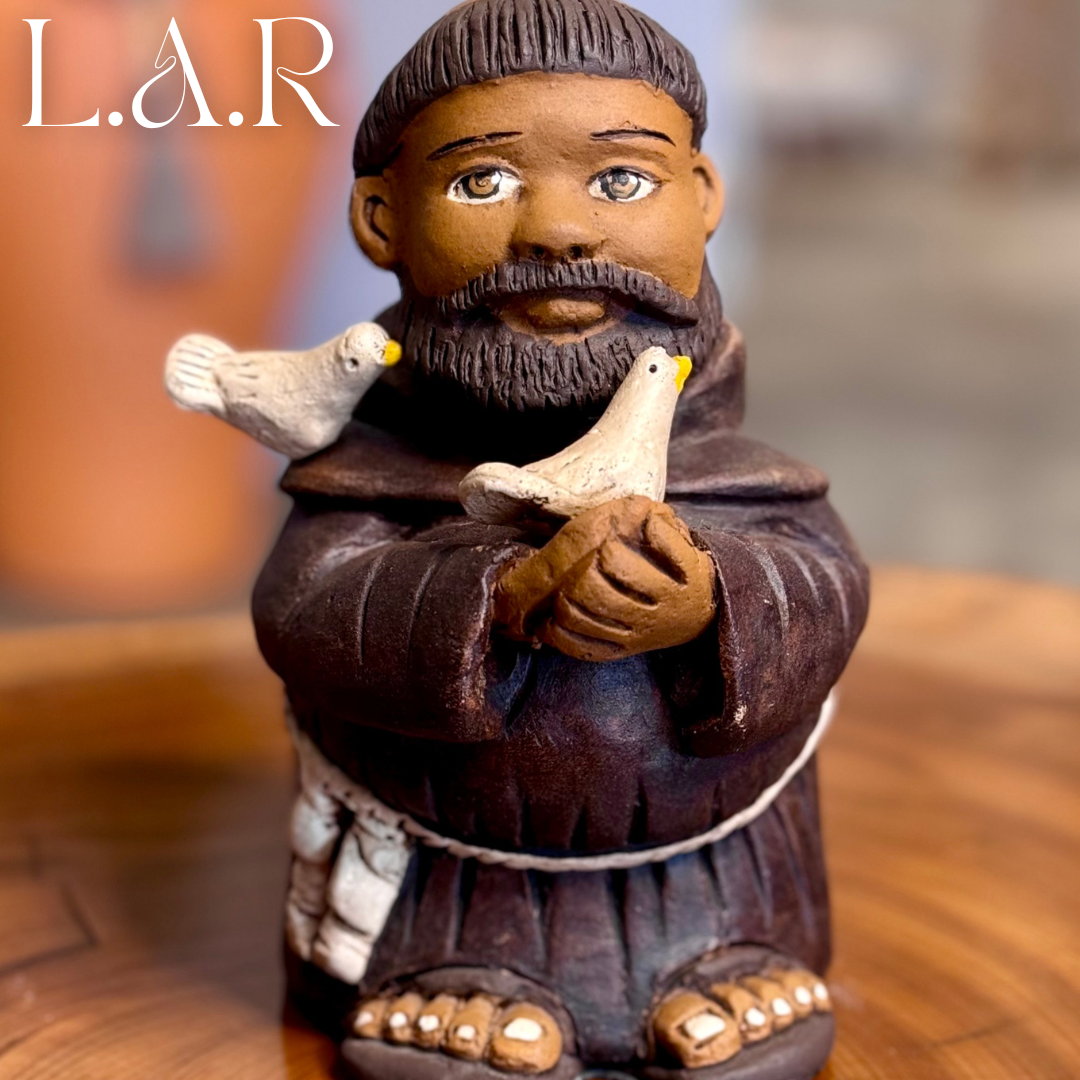 Essa escultura de barro pintada a mão, representa o São Francisco de pé e sereno, com pombinhas repousando sobre si. Ela foi produzida por artesãos do estado do Piauí e, é perfeita para presentear devotos de São Francisco, veterinários e amantes dos animais e da natureza.